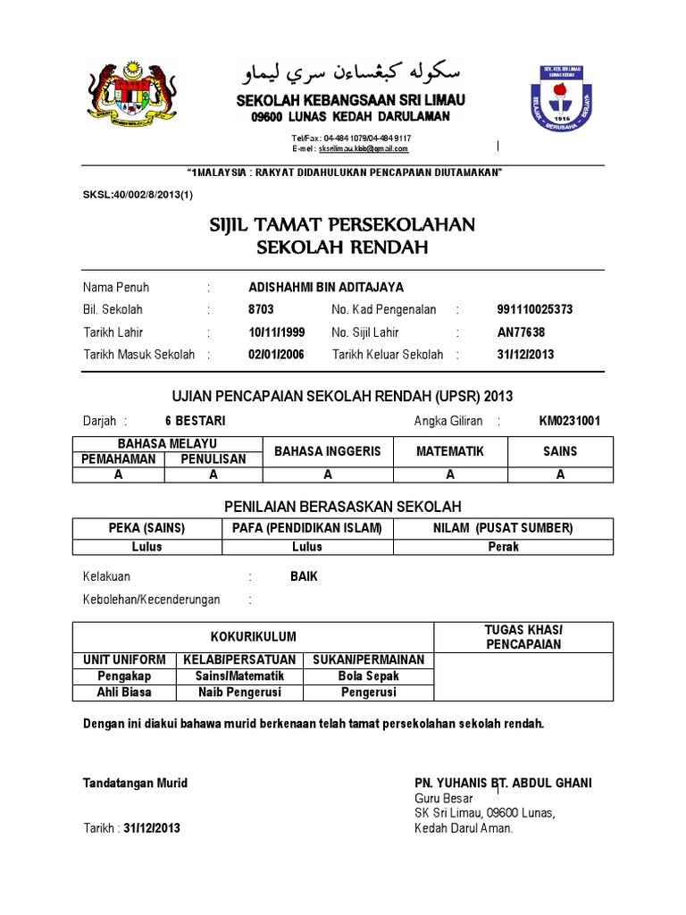 Sijil Tamat Persekolahan Sekolah Rendah Pdf